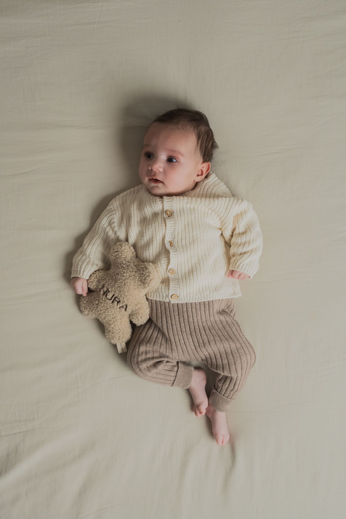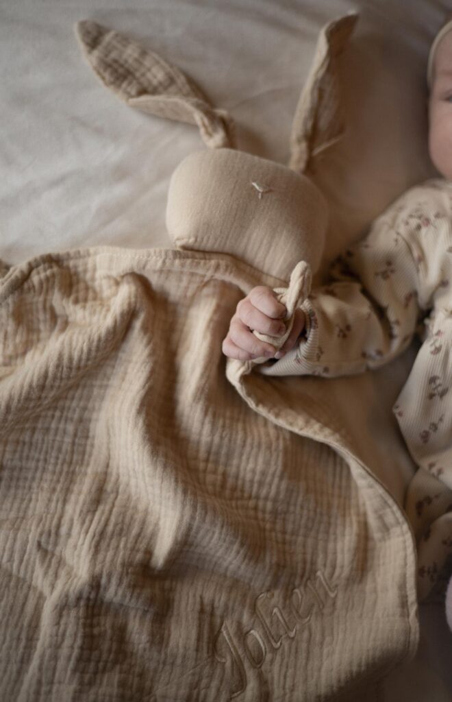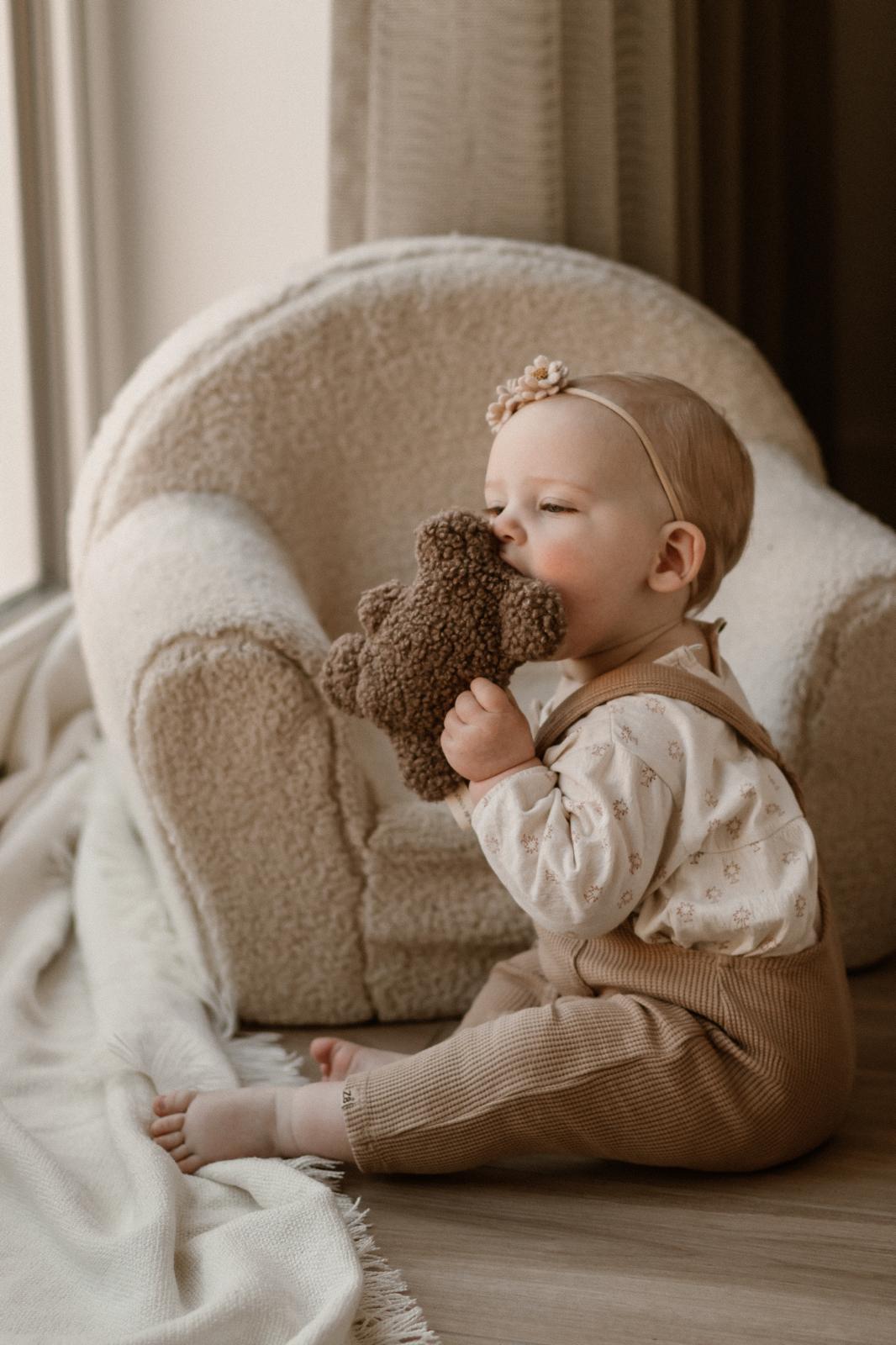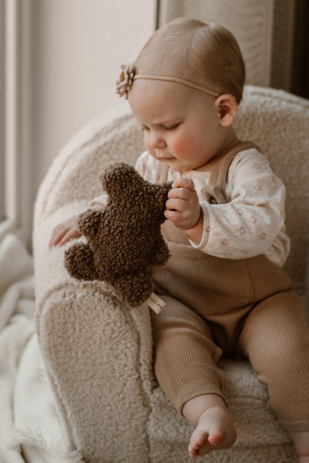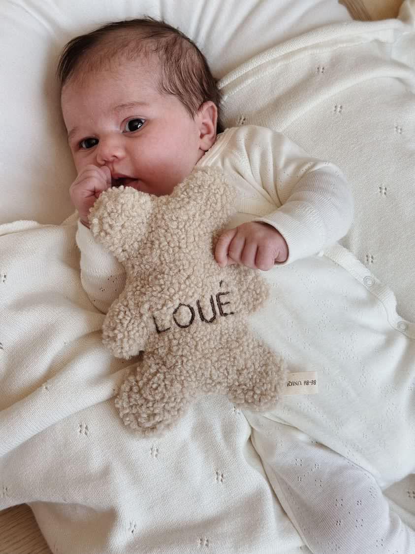Dit schattige knuffelbeertje wordt met zorg met de hand gemaakt van zachte teddy stof en is verkrijgbaar in twee stijlvolle kleuren: ecru of taupe. Kies voor een persoonlijke touch door de naam van het kindje erop te laten borduren.